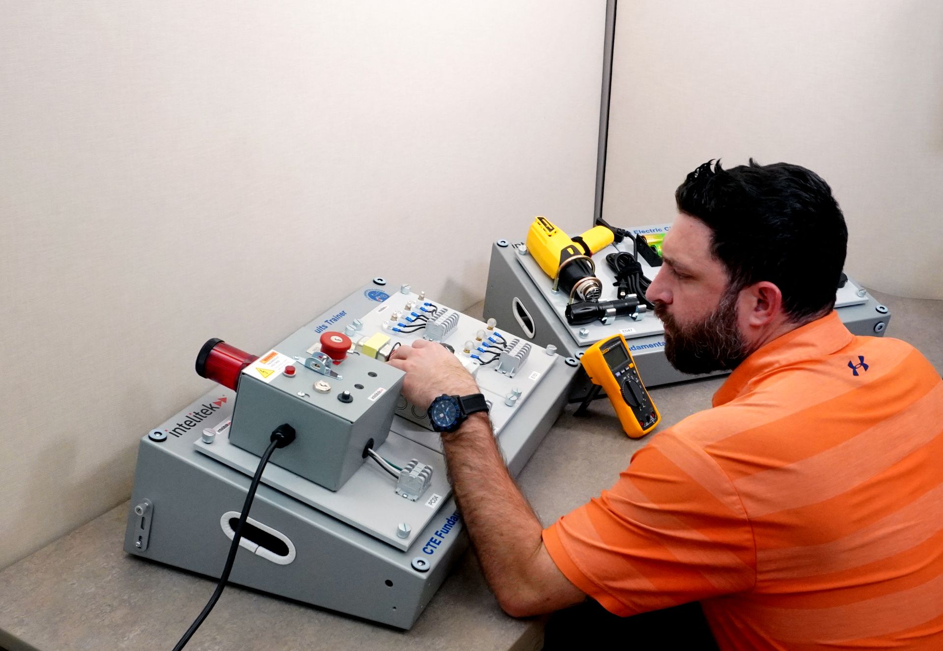 The tabletop lab system lets students design and build real industrial electrical circuits, taking learning beyond the textbook and into applied practice. Paired with Intelitek’s online curriculum, students explore essential topics such as circuit safety, voltage and current measurement, schematic reading, power testing, and electrical troubleshooting — all aligned with real-world industry practices.